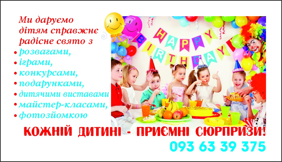 Ми даруємо дітям справжнє радісне свято з клоунами, іграми, подарунками! У нас є веселі, добрі, казкові, герої-аніматори, які люблять діток і допомагають зробити День народження чи будь-яке свято яскравим і незабутнім.